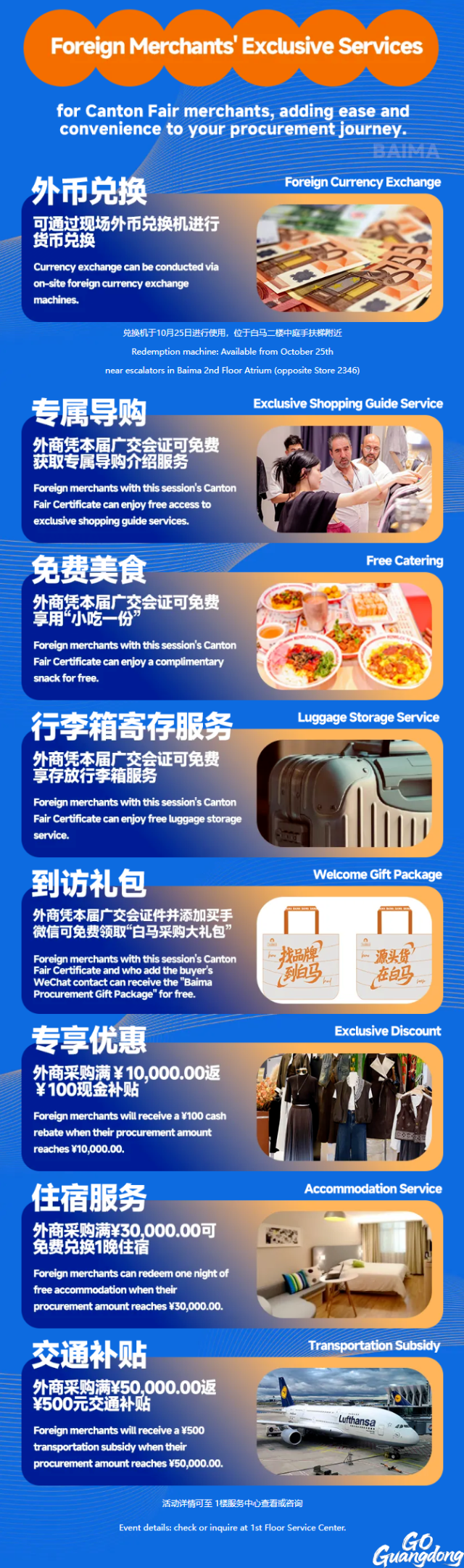 The 138th Canton Fair kicked off in Guangzhou on October 15, drawing buyers and visitors from all over the world. During the period, Guangzhou Baima launches a series of procurement benefits and tailored services for buyers, ensuring a premium and smooth experience throughout their sourcing journey.