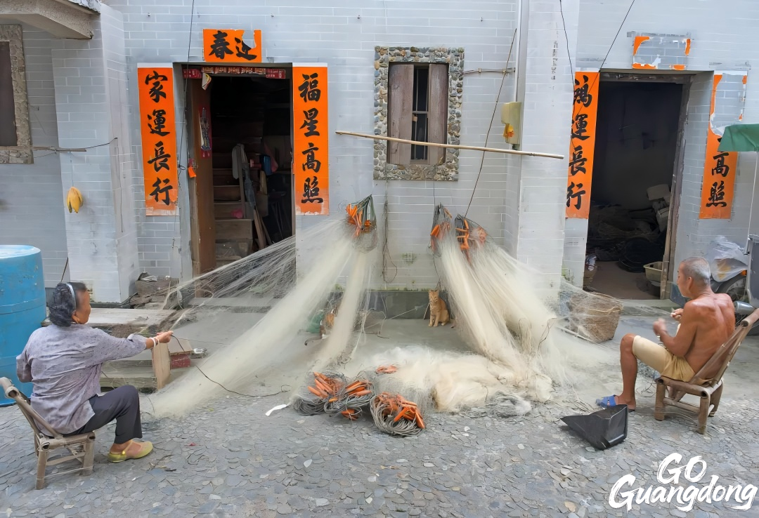 Fisher family weaving nets in their residence, photo by 广东阳江发布